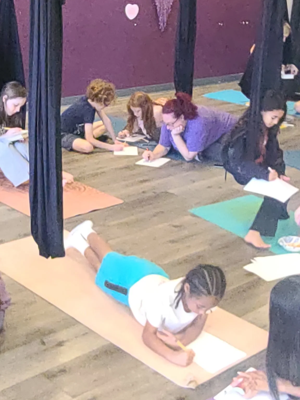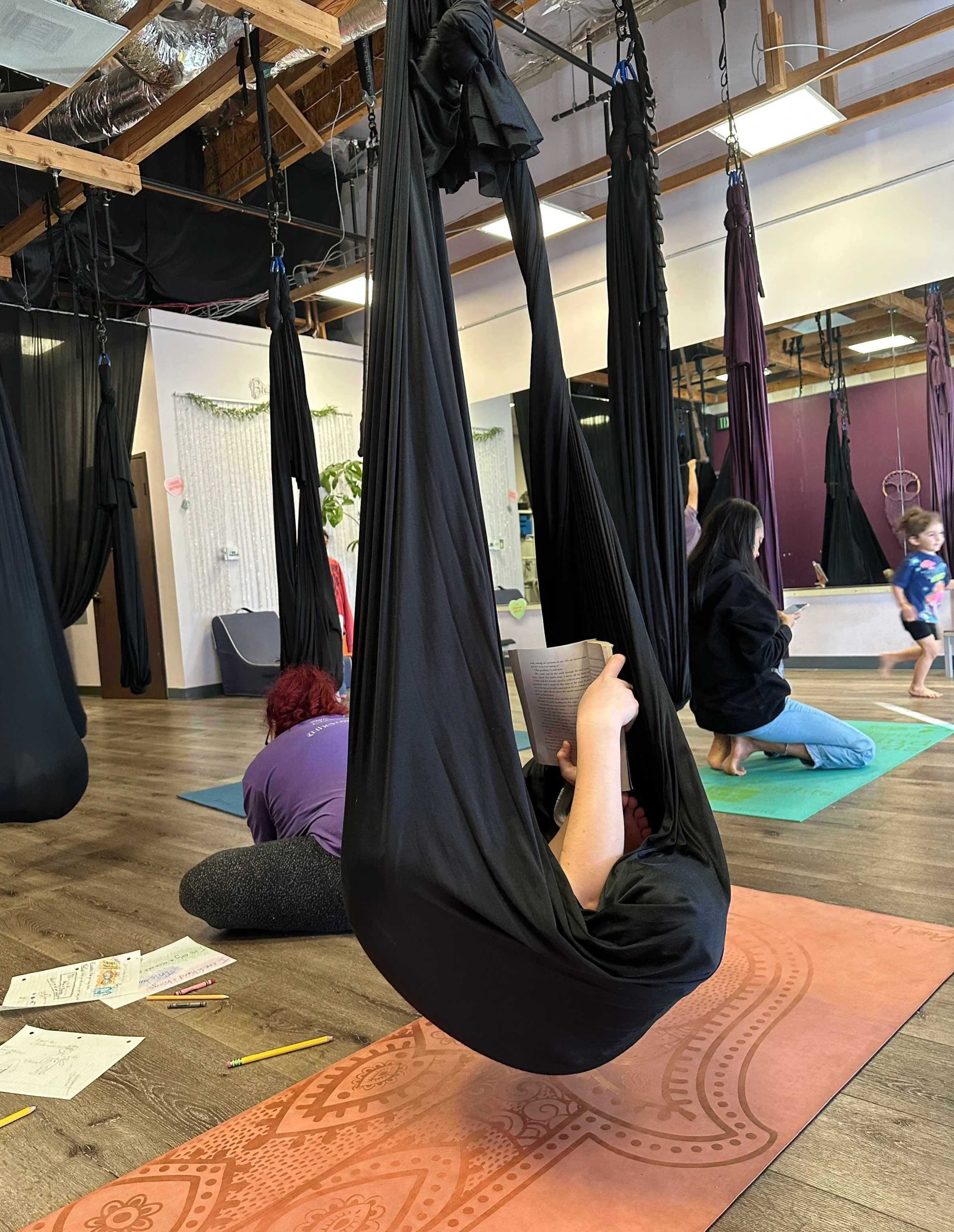 Yesterday afternoon, The Yoga Dance Co gave space for families to come together for some special reflection time - with a guided journaling session, quiet reading in the hammocks, and conversation around how we process emotions and express our feelings. Hammocks gently swayed. Books were opened. Pens moved across journal pages. Moms and kids gathered around the studio on yoga mats or in comfy seats or swings, and Ms. Auburn led us through a time of soft reflection on how we carry ourselves when things get heavy.